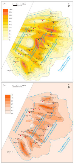 We analyzed the horizontal distribution characteristics of reservoir parameters using a geostatistics method with E31-IV-4 as an example. The average permeability, mean variation coefficient, mean range difference, and rush coefficient of the selected single reservoir are 7.8 mD, 0.86, 66.3, and 3.4, respectively. A comprehensive evaluation of reservoir heterogeneity is strong. The permeability distribution map of the reservoir is shown in Figure 9a. The long axis of the isoline is in the direction of northwest to southeast. The permeability changes from low to high and then to low from west to east, and the composite channel in the middle fan has the best permeability. The permeability variation coefficient is distributed in a circular band, as shown in Figure 9b. The composite channel unit heterogeneity in the inner side of the middle fan is the strongest, and its variation coefficient is >0.7. This unit is followed by the lateral alternated unit with braided channel and sheet flow sediment on the lateral side of the middle fan, and its variation coefficients are in the range of 0.3–0.9. The extensively connected body unit sandwiched with intermittent channels in the inner fan showed moderate reservoir heterogeneity, with its variation coefficients in the range of 0.3–0.5.