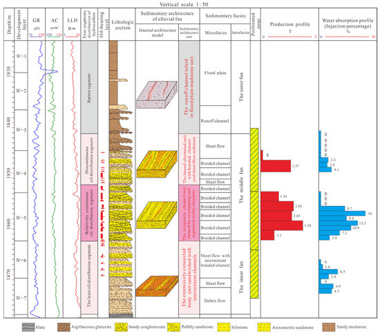 By integrating the aforementioned geological features, we believe that the Qie12 block is an alluvial fan, which is a genetic type of thick sandy conglomerate. In the alluvial fan, there are five sedimentary microfacies: a fourth-order architectural element [16] that includes a braided channel, debris flow, sheet flow, runoff channel, and flood plain. According to the vertical assemblage of different architectural elements and the distribution pattern of interlayers [17,18], we also identify four fifth-order architectural units: the extensively connected body unit sandwiched with intermittent channels, the composite channel unit formed by overlapping and separated stable channels, the lateral alternated unit with braided channel and sheet flow sediment, and the runoff channel inlaid in flood plain mudstone.