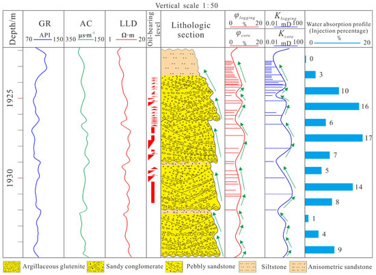 WellQ12-10-8, with a depth range of 1872–1875 m, is a homogeneous rhythmic debris flow deposit (Figure 5c). Its permeability rush coefficient and ratio are 1.7 and 18, respectively.