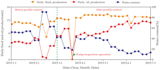 In summary, reservoir heterogeneity plays an important role in controlling the distribution of remaining oil. We note that deep profile control and oil displacement technique are key to the comprehensive management of the composite channel unit formed by overlapping and separated stable channels or the lateral alternated unit with braided channel and sheet flow sediment. Meanwhile, to tap the potential of the remaining oil in the extensively connected body unit sandwiched with intermittent channels, we need to depressurize, increase the injection, and improve the quality of the reservoir. The study effectively guided the deep profile control of the test well group, and it achieved practical results. Under the premise of an unchanged production system and after profile control, the daily fluid production of a single test well (i.e., Q12H13-9) was stable (Figure 13). The test well’s daily oil production increased by approximately 40%, whereas its water content decreased by 35%.