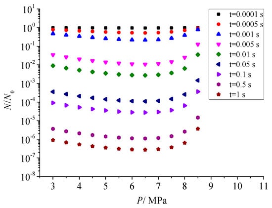 The variation of sulfur particle size distribution with the time is discussed in the previous part. The nv/N0 has a large variation range, as low as order of magnitude 10−7 at 0.5s. In order to further analyze the change of the proportion of sulfur particles of different sizes in the total number of sulfur particles at the same times, the curves of nv/N at different times after coagulation are drawn, as shown in Figure 20 and Figure 21. For the convenience of observation, the abscissa of Figure 20 is the logarithmic axis, and the abscissa of Figure 21 is the conventional axis.