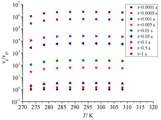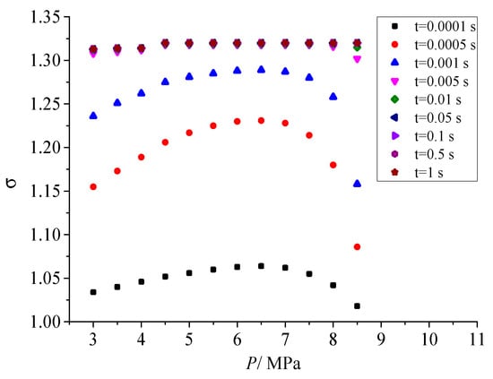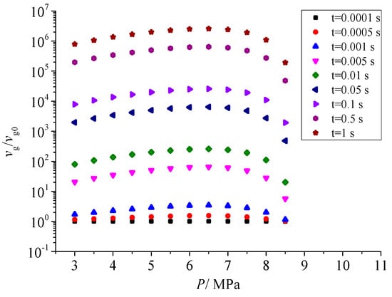 Figure 19 shows the relationship between the size distribution of sulfur particles and the actual time within a period of time after the coagulation of sulfur crystal nuclei. The abscissa dp in the figure represents the diameter of the sulfur particles. The ordinate nv/N0 represents the ratio of the number of sulfur particles with a diameter dp to the number of initial sulfur particles N0. Figure 19a–h represent the change of sulfur particle size within 0.0001 s to 0.5 s after the coagulation sulfur crystal nucleation. The calculation example is mainly aimed at the law of coagulation and growth of the part of the sulfur crystal nucleus precipitated after throttling with time, without considering the influence of the sulfur crystal nucleus continuously precipitated in the pipeline on the coagulation and growth of the previous sulfur crystal nucleus.