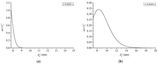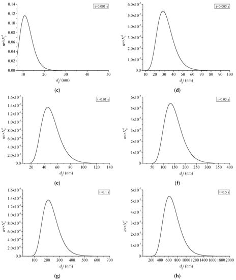 From the change of ordinate, the maximum value of nv/N0 decreases gradually with the passage of particle coagulation time, indicating that the number of sulfur particles of different sizes decreases with the passage of time. From the change of the abscissa value range, the minimum value of the abscissa in the figure is the diameter of the critical crystal nucleus, and the maximum value keeps increasing, indicating that more and more sulfur particles with a larger particle size appear. The shape of the whole normal distribution curve is unchanged, and the whole curve shifts toward the larger particle size. As shown in Figure 19a–c, when the coagulation time of sulfur crystal nuclei is less than 0.001 s, the size distribution curve of sulfur particles is not complete. This is because the initial particles of coagulation are sulfur particles with critical nuclei, and at this time the sulfur particles can only grow gradually. According to the characteristics of Brownian coagulation with normal distribution, sulfur particles smaller than the critical radius do not exist, so the situation shown in Figure 19a–c appears.