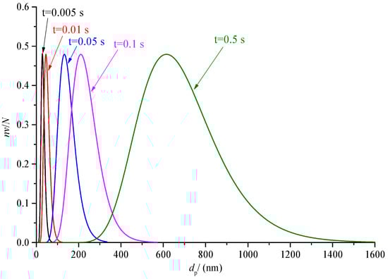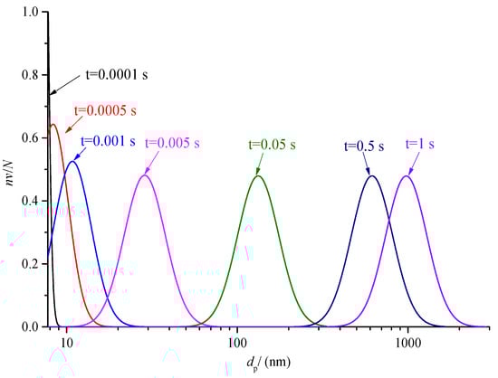 Müller et al. (1928) derived the transport equation of polydisperse particles based on Smoluchowski’s transport equation for monodisperse particles, as shown in Equation (17) [31]. This equation can also be used as the governing equation for the growth size of sulfur particles with time.
