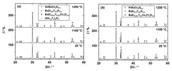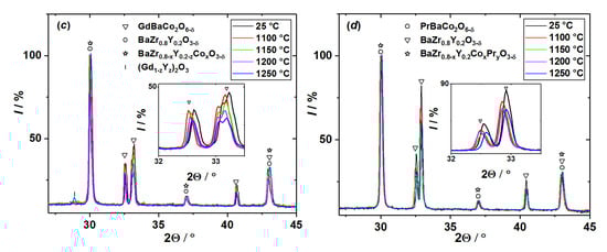The results of chemical compatibility experiments are shown in Figure 1 and Figure S2. At a first glance, XRD patterns of the sample mixtures look very similar, at least, at temperatures lower than 1100 °C. Such XRD patterns can be readily found in the current literature along with a typical conclusion that they indicate the absence of chemical interaction between the components of the mixture investigated. However, the XRD pattern of the GdBaCo2O6−δ + BaZr0.8Y0.2O3−δ mixture calcined at the highest studied temperature (see Figure 1) clearly indicates the formation of a new compound isostructural to Gd2O3 (possibly doped by Y2O3). Furthermore, the intensities of the peaks corresponding to the components of the mixtures as well as peaks’ positions (and, hence, lattice parameters) depend on the calcination temperature as seen in Figure 1c,d. For example, the intensities of the peaks corresponding to double perovskites RBaCo2O6−δ (R = Gd, Pr) strongly decrease with calcination temperature. At the same time, XRD peaks of BaZr0.8Y0.2O3−δ slightly increase in intensity and shift towards high 2Θ° angles. Similar changes can be observed in the XRD patterns of the mixtures containing NiO; see Figure S2. All these evidences undoubtedly indicate in favor of chemical interaction between double perovskites and a solid electrolyte which occurs already at 1100 °C and likely at lower temperatures. The XRD results seem to suggest at least partial dissolution of RBaCo2O6−δ (R = Gd, Pr) in BaZr0.8Y0.2O3−δ oxide. Therefore, the similarity of the XRD patterns of the starting mixture (denoted as 25 °C in Figure 1) and the one calcined at 1100 °C cannot be used as evidence of the absence of chemical interaction.