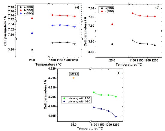 The unit cell parameters vs. annealing temperature of powder mixtures RBaCo2O6−δ (R = Gd, Pr)–BaZr0.8Y0.2O3−δ (50:50 wt.%): (a) GdBaCo2O6−δ, (b) PrBaCo2O6−δ and (c) BaZr0.8Y0.2O3−δ.