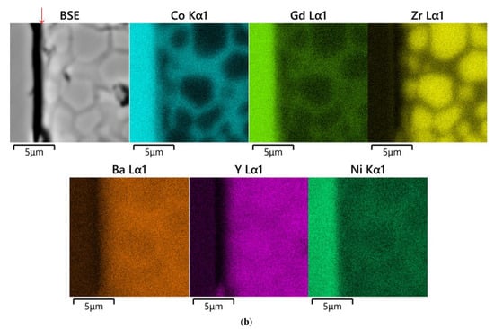 The diffusion couple GdBaCo2O6−δ–BaZr0.8Y0.2O3−δ+NiO (1 wt.%) annealed at 1200 °C for 48 h in air does not show the formation of Gd2O3 as a reaction product, contrary to the couple without NiO. Instead, diffusion of Gd3+ into the electrolyte phase occurs mainly through the grain boundary mechanism, as seen in Figure 3b. Similar behavior is evident for diffusion of Co ions. As a result, the formation of Ba1.03Co0.81Ni0.03Gd0.13O3−δ oxide was detected on the grain boundaries of the electrolyte pellet near the interface with double perovskite, whereas the composition of the electrolyte grains’ bulk corresponds to Ba1.02Zr0.78Y0.16Co0.04O3−δ. In addition, the diffusion of Ni2+ ions from the electrolyte pellet to the GdBaCo2O6−δ phase was observed.