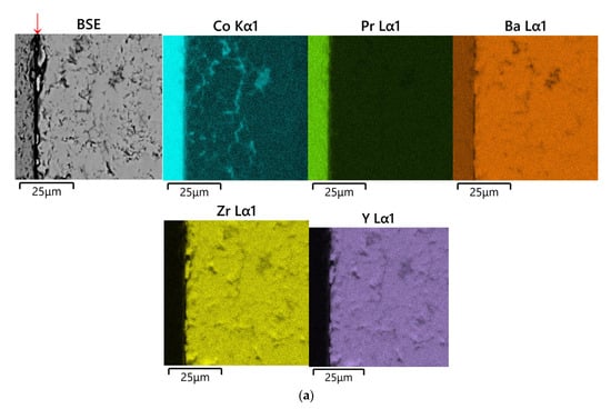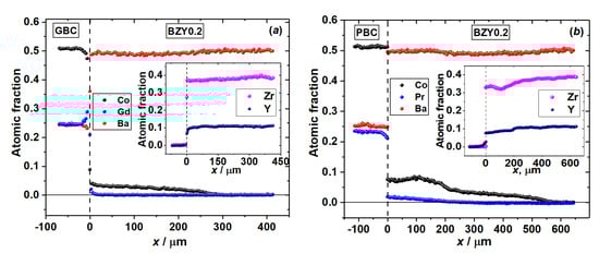 In the case of the PrBaCo2O6−δ–BaZr0.8Y0.2O3−δ couple annealed at 1200 °C for 48 h in air, significant diffusion of both Co and Pr into the BaZr0.8Y0.2O3−δ pellet was found, as shown in Figure 4a. Their diffusion occurs both along the grain boundaries and through the bulk of BaZr0.8Y0.2O3−δ. The former mechanism is dominating. The diffusion depth of Co reaches 560 μm. The analysis of the grain boundary phase’s chemical composition gives near the interface PrBaCo2O6−δ|BaZr0.8Y0.2O3−δ the following averaged composition: Ba1.02Co0.72Y0.21Pr0.09O3−δ. However, the composition of the grains’ interior may be expressed as Ba0.99Zr0.69Y0.16Co0.13Pr0.03O3−δ.