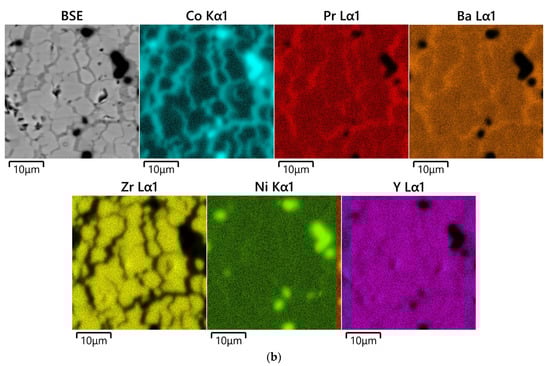 SEM images and concentration maps of reaction zones for diffusion couples after annealing at 1200 °C for 48 h in air: (a) PrBaCo2O6−δ–BaZr0.8Y0.2O3−δ; BSE image and element maps obtained near the phase boundary of diffusion couple and (b) PrBaCo2O6−δ–BaZr0.8Y0.2O3−δ+NiO (1 wt.%); BSE image and element maps obtained in the area of Co diffusion maximum in the depth of about 500 μm from the phase boundary. The corresponding images near the phase boundary of the diffusion couple may be observed in Figure S3. The red arrow marks the interface between the pellets.