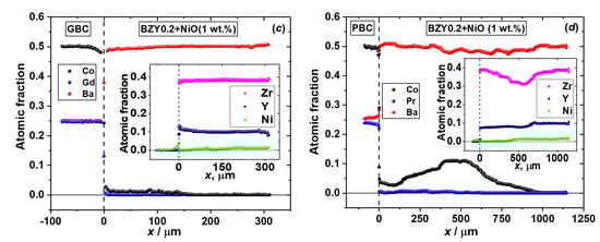 The averaged (over the cross section area) concentration profiles illustrating the above-mentioned distribution of different species in the diffusion zone of the RBaCo2O6−δ (R = Gd, Pr)|BaZr0.8Y0.2O3−δ+NiO (0, 1 wt.%) couples annealed at 1200 °C for 48 h in air are shown in Figure 5.