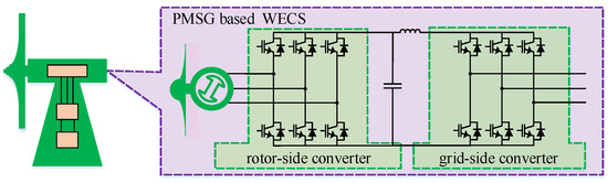 To make the most of the renewable energy resources, voltage source converters (VSCs) are introduced into the energy conversion systems [9,10,11,12]. As an intuitive example, Figure 1 presents a typical wind energy conversion system (WECS). From this figure, it can be seen that the permanent magnet synchronous generator (PMSG)-based wind turbine is connected to the grid through two VSCs, i.e., a rotor-side converter (RSC) and a grid-side converter (GSC). These converters decouple the rotor speed of the wind turbine from the grid frequency, thus reducing the grid inertia and posing a risk to the stable operation of the power system.
