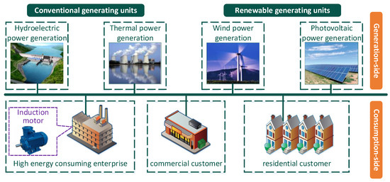 Given the significance of frequency stability in power systems, it is unsurprising that research efforts have predominantly centered on grid inertia. Currently, the literature about grid inertia mainly focuses on the inertia of conventional generating units and renewable energy generating units [13,14,15,16]. Specifically, conventional generating units such as a thermal generating unit and a hydroelectric generating unit, are connected to the grid directly. Therefore, when the grid frequency decreases (or increases), the rotor speed of the conventional generating unit decelerates (or accelerates). Correspondingly, the kinetic energy stored in the rotating rotor is naturally used to provide inertial support. When it comes to renewable energy generating units, there is a widely held belief that they make no contribution to the grid inertia. The reason is that these renewable energy generating units are connected to the grid through VSCs, thus they are decoupled from the grid. However, with the proper design of an additional inertia support controller, renewable energy generating units can provide inertia support to the grid, thus increasing grid inertia [17,18,19,20]. Specifically, in addition to generation-side units, there are a considerable amount of induction motors on the consumption-side, as shown in Figure 2. These induction motors can also contribute to grid inertia due to their stored kinetic energy. In a power system with a high penetration of renewable energy, the influence of induction motors on grid inertia becomes more prominent.