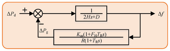 where denotes grid frequency deviation, H presents the grid inertia constant, usually within 3~9 s [29], D denotes the frequency damping coefficient of the utility grid, represents the conventional generators’ power variation subsequent to the occurrence of a load disturbance, and is grid load disturbance resulting from sudden load changes, either load increases or load decreases. In (1), the dynamics of and are [30]