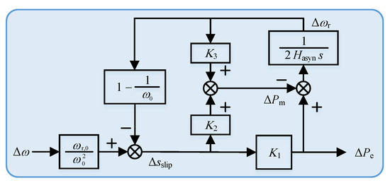 From Figure 3, we can find that the grid inertia is relative with the deviation of power (i.e., and ) and grid frequency (i.e., ). Inspired by this observation, the relationship between the deviation of induction motor’s input active power (i.e., ) and grid frequency (i.e., ) should be derived to precisely investigate the influence of the induction motor on the grid inertia.