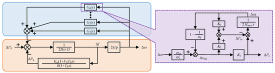 Because is proportional to , that is, , the induction motor’s small-signal model is easily integrated into the low-order system frequency response model. Moreover, there are many induction motors in grid, which can be clustered into a certain number of representative induction motors according to their characteristics. Considering these two facts, the detailed grid frequency response model considering multiple induction motors can be derived from Section 2.1 and Section 2.2, as shown in Figure 5.