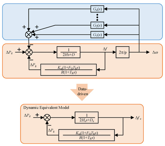 To fill this gap, a grid dynamic equivalent model (DEM) will be proposed in this section, as shown in Figure 6. From this figure, we can find the proposed DEM is the same structure as the low-order system frequency response model, but with different parameter values. Specifically, the grid damping coefficient and inertia constant are replaced by the corresponding equivalent values, that is, H and D are replaced by and , respectively. These two equivalent values can be identified using the data-driven approach, which will be introduced in the next section. The DEM is structurally simpler and therefore easier to apply in practice compared with the detailed grid frequency response model.