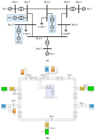 Figure 7. The modified IEEE 9-bus system. (a) Single-line diagram. (b) Simulink block diagram. - Benchmark IEEE 9-bus system: The benchmark IEEE 9-bus system is derived from the above modified IEEE 9-bus system, whose block diagram is shown in Figure 8. The benchmark IEEE 9-bus system is also implemented in MATLAB Simulink using the Special Power Systems library. The only difference between these two systems is that in the benchmark system, the induction motors are replaced with the equal capacity constant loads. Specifically, IM 1, IM 2, and IM3 are replaced with Load 1, Load 2, and Load 3, respectively, whose parameters are listed in Table A6.