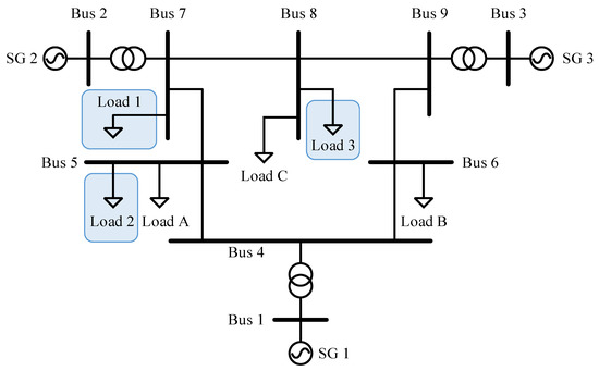 - Modified IEEE 9-bus system: The modified IEEE 9-bus system is implemented in MATLAB Simulink using the Special Power Systems library, whose block diagram is shown in Figure 7. It is the modified version of the actual IEEE 9-bus system. In the modified system, there are three synchronous generators, that is, SG 1, SG 2, and SG 3, on the generation-side. All of them are connected to the grid via transformers. The parameters of these three synchronous generators are presented in Table A1. On the consumption-side, three constant loads, i.e., Load A, Load B, and Load C, are connected to the grid, and whose parameters are listed in Table A2. Moreover, three induction motors, that is, IM 1, IM 2, and IM 3, are also integrated into the grid on Bus 7, Bus 5, and Bus 8, respectively. Considering that the induction motors are predominantly employed in high energy consumption enterprises, where they are either in operation or planned to be stopped, the operation conditions of these three induction motors are assumed unchanged, that is, they always work near the initial operation point. The parameters of the induction motors, transformers, and transmission lines are shown in Table A3, Table A4 and Table A5, respectively.