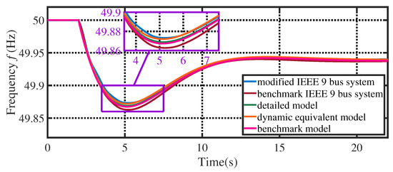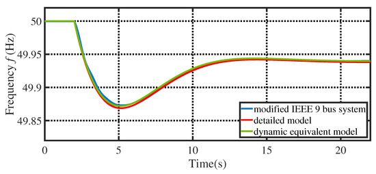 Grid frequency dynamics of the modified system, the detailed model and the dynamic equivalent model during the under-frequency event.