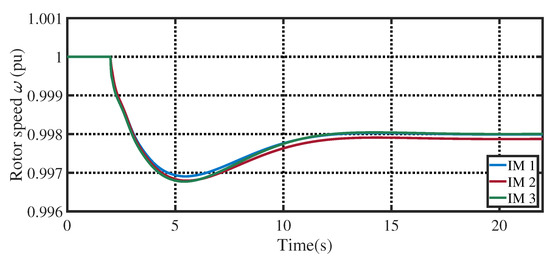 In Section 2.1 and Section 2.2, the induction motor’s small-signal model and low-order grid frequency response model have been derived, respectively. With this low-order system frequency response model, we can see that the grid frequency deviation (i.e., ) is determined by the power mismatch between the generation and load (i.e., ). Moreover, with the induction motor’s small-signal model, we can also find that the active power response of the induction motor (i.e., ) is related to the rotating magnetic field speed deviation of the stator ().