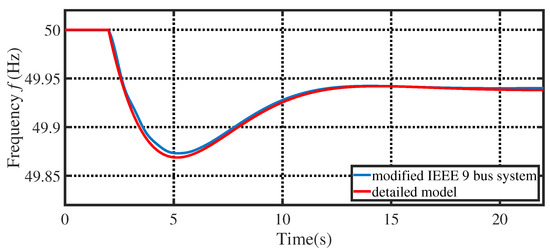 To do so, five additional scenarios, where the grid load disturbance is set to 2%, 4%, 6%, 8%, and 10%, are employed. The frequency dynamics of the IEEE 9-bus system and dynamic equivalent model under different load disturbance have been presented in Figure 18. From this figure, we can see that when , the dynamic equivalent model can accurately reproduce the frequency dynamics of a grid with multiple induction motors. However, when the grid load disturbance is too large (such as ), the fidelity of the model is reduced. From this point of view, the proposed dynamic equivalent model is more accurate in the case of small grid load disturbance.