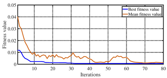 After the population is generated, each individual, i.e., vector , has a specific value. Considering the fact that the main objective of the identification approach is to minimize the mismatch between and , for k-th individual, its fitness value can be calculated by