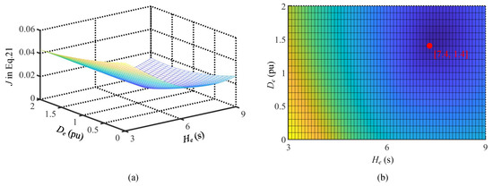 In this work, considering the fact that the optimal problem (19) and (20) is high non-convexity, one of the intelligence algorithms, i.e., a genetic algorithm, has been employed to identify the equivalent parameters of the grid dynamic equivalent model. However, these intelligent algorithms may not guarantee the globally optimal values once the termination criterion has been achieved. In other words, the solution calculated by the intelligent algorithm may be a locally optimal one. Even worse, in the presence of an optimal problem with multiple local minima, the assurance of achieving a globally optimal solution cannot be guaranteed upon subsequent execution of the intelligent algorithm. Fortunately, an ad hoc approach makes it possible to fill this gap. By plotting the J, i.e., (21), in terms of and , this ad hoc approach can provide the globally optimal value. Nevertheless, there remains a concern with employing the ad hoc approach. That is, the accuracy and computational cost of the method are determined by the mesh partition of and . Specifically, if the partition step size is too large, the calculation results may not meet the required level of accuracy and the computational cost may become prohibitively high. From the above observations, we employ the genetic algorithm to find the optimal solution of the problem (19) and (20). Meanwhile, the ad hoc approach with a slightly larger partition step size is employed to guarantee the solution of the genetic algorithm is the globally optimal one.