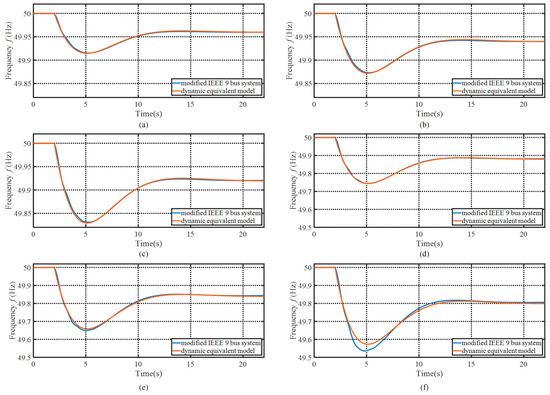 Frequency dynamics of the IEEE 9-bus system and dynamic equivalent model under different load disturbance . (a) , (b) , (c) , (d) , (e) , and (f) .