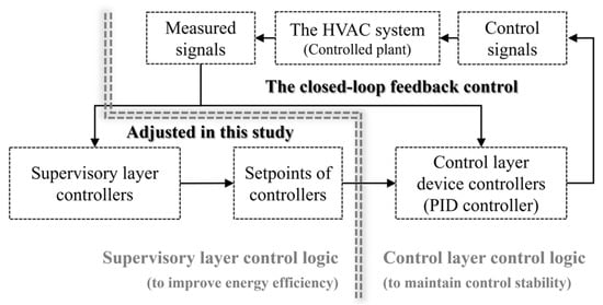 In addition, for the convenience of the following formulation and implementation of the optimization strategies, the system is controlled by a two-layer structure (as shown in Figure 2), including a supervisory layer and a control layer. The goal of the supervisory layer is to optimize the operation of the HVAC system and, while satisfying the cooling demand, reduce the system’s energy consumption by adjusting setpoints of controllers. The control layer is responsible for the direct control of components from different parts of the system (for example, valves, and frequency converters), and this layer is also responsible for tracking given setpoints via the closed-loop feedback control (for example, the track of the chilled water supply temperature setpoint is achieved by the PID control of the chiller’s compressor frequency). Under this control structure, direct open-loop optimization control of components is avoided, which ensures the stability of the system’s operation [4].
