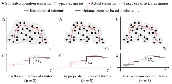 The rationality of the number of clusters can be judged by the difference of the optimal setpoints between adjacent typical operation scenarios. Figure 4 shows the change of the optimal setpoints when the number of clusters differs. and in the figure represents the descriptive variables of the typical scenarios, and is the value of the optimal setpoint. As shown in the figure, when the number of clusters is too small, the similarity between adjacent typical operation scenarios is low, and the corresponding optimal setpoints also display large discrepancies (). In this case, each typical scenario includes too many operation scenarios, and the ideal optimal setpoints of these scenarios in one cluster differ greatly. Such differences are ignored and will affect the final implementation of the strategies. On the other hand, when the number of clusters is too large, the operation scenarios with high similarity are not well classified, resulting in a small difference in optimal setpoints between the adjacent typical scenarios (). The optimization of these typical scenarios does not bring much improvement on the implementation effect of strategies, and on the contrary, the efficiency of generating the training dataset declines if the number of clusters is too large.
