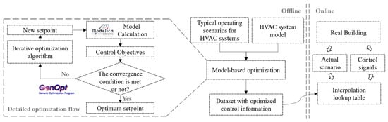 To verify the rationality and high efficiency of the method above for constructing the training dataset, an optimization framework was built (as shown in Figure 5) based on Coffey’s framework [38,39]. The framework consists of two parts. One is for the offline optimization, and it calculates the optimal setpoints of the HVAC system under typical operation scenarios, thus generating the training dataset. The other part of the framework is for online implementation of strategies, which guides the operation of the actual system by the lookup table. Such an offline optimization framework is relatively simple. Moreover, by applying the lookup table instead of using complex machine learning techniques to extract rules from the training dataset, excessive processing on the training dataset is avoided. Therefore, the quality of the training dataset can be directly reflected.