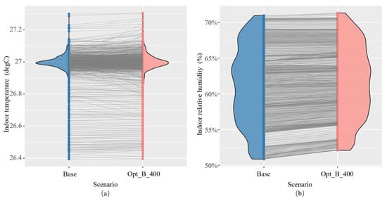 (a) Comparison of room temperature under two strategies; (b) Comparison of indoor relative humidity under two strategies. (In the figure, red represents the use of Opt_B_400 scheme, blue represents the use of Base scheme).