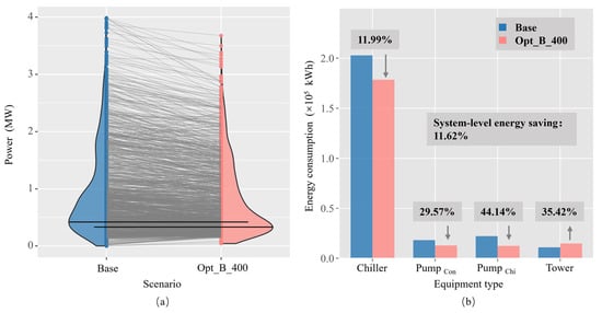 Reducing energy consumption is a primary goal of optimal control. Figure 10a and Figure 10b, respectively, show the real-time power distribution and cumulative energy consumption of the two schemes, where the gray lines reflect the real-time power difference of the two schemes. From the figure, it can be observed that the gray lines connecting the Base group and the Opt_B_400 group show a downward trend. In terms of cumulative energy consumption, except for the cooling towers, the energy consumption of other equipment in the Opt_B_400 group is also lower to some extent. Additionally, calculations show that the Opt_B_400 group reduced overall energy consumption by 12.14% compared to the Base group. These pieces of evidence demonstrate that the method for acquiring the training dataset described in this paper can support the offline optimization framework to achieve the goal of reducing energy consumption.