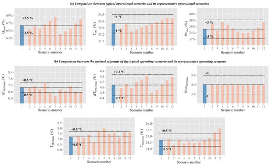 To investigate the effect of the clustering approach on the setpoints, we selected all the operation scenarios represented by the dark gray area in Figure 11 from the simulated data of the entire cooling season, and analyzed their setpoints. Figure 12 shows the composition of the operation scenarios before and after clustering, and the changes in the optimal setpoints under these scenarios. Part (a) shows the differences between typical operation scenarios and the similar scenarios that the typical ones represent, while Part (b) shows the differences in the optimal setpoints under these operation scenarios. From the figure, it can be seen that, on the one hand, the difference between typical operation scenarios and their similar scenarios is relatively small, with less than 1 °C in outdoor dry bulb temperature and less than 3% in both the outdoor relative humidity and cooling load ratio. On the other hand, the optimal setpoints for both types of scenarios also show certain similarities, with the difference in optimal setpoints for continuous variables within 1 °C and the optimal setpoints for discrete variables remaining consistent.