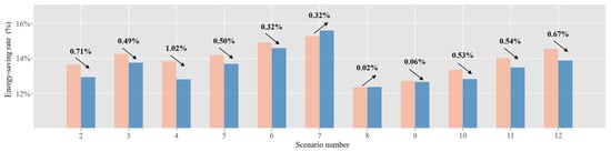 Finally, we analyzed the energy saving reduction caused by the changes in setpoints, and the results are shown in Figure 13. It can be seen that for these operation scenarios, the reduction in energy savings caused by using constant setpoints calculated from a typical operation scenario is limited (ranging from 0.02% to 1.02%) compared to optimizing each operation scenario individually with its corresponding optimal setpoints. In some operation scenarios (Scenario 7 and 8), there are even cases where Opt B has higher energy savings than Opt A, which is due to the local optima caused by the uncertainty of solution errors in the algorithm. Such results further demonstrate that reducing the number of operation scenarios does not have a significant impact on energy savings, which also confirms the validity of the method described in this paper.