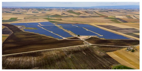 One of the main drawbacks still hampering the widespread diffusion of photovoltaic energy is the fact that it is a low power-density energy source. As recently reported by Bolinger and Bolinger [] in a study that considered most of the utility-scale PV plants built in the United States up until 2019, at present, the average photovoltaic power density that can be installed for a ground-mounted PV (GMPV) utility plant (dependent on the latitude of the installation site) is roughly 70 W/m2–90 W/m2 for a fixed-tilt system and around 49 W/m2–74 W/m2 for a tracking solution. An example of a GMPV utility plant is the largest fixed-tilt PV system realized in Italy in Troia (Apulia) between 2019 and 2021, which is characterized by a power density of about 70 W/m2 (Figure 1) [].