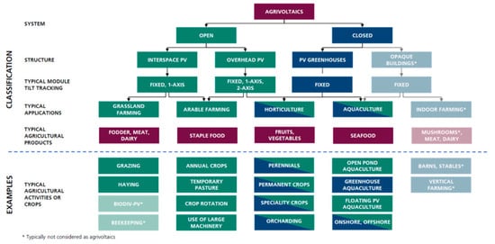 Agrivoltaic systems are characterized by large combinations of possible PV technical solutions (type of modules, mounting structures, etc.) and possible different uses of the land, such as grassland farming, arable farming, etc.). The general classification scheme above-reported is extracted from Ref. [].