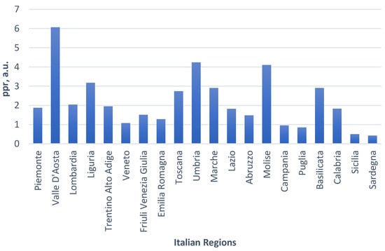 Data show that the annual agricultural revenue for most extensive crops considered here is too low to allow the implementation of APV in comparison with a GMPV plant unless proper subsidizing schemes are conceived. In all cases, the ppr would be larger than 1 for any suitable β value. On the contrary, APV is a possible option for areas dedicated to potato crops. In this case, however, the complexity of the APV design that can be considered is strongly dependent on the specific region. In Sardegna, APV with a β value up to four can still be considered economically advantageous, while in Veneto, for instance, only β values around two are acceptable. In Figure 5, the ppr value is calculated from Equation (30), assuming that β = 2. Only in Veneto, Puglia, Campania, Sicilia, and Sardegna can APV implementation be considered economically advantageous for potato cropland activities. In terms of specific crops, such a frame does not substantially change, even considering a doubling of VAP during the whole APV plant lifetime, thus relaxing the approximation in Equation (22). In such a case, for potato crops, β values even higher than four can be considered feasible in Veneto, Puglia, Campania, Sicilia, and Sardegna.