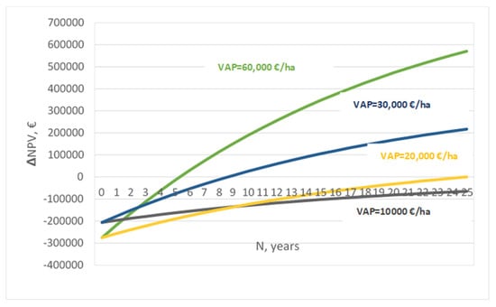 , for β = 3.5 and for some valus of VAP. Only values higher than 20.000 EUR/ha make this difference positive.