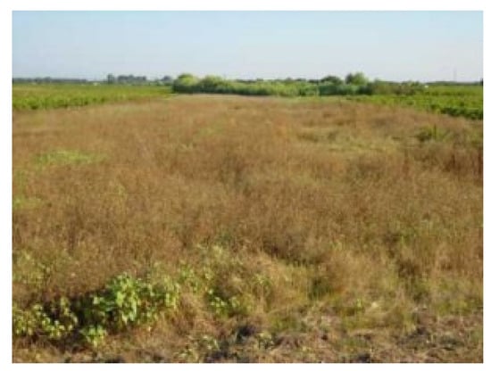 Therefore, at least for Italy and for the crops investigated, in order to consider a concrete implementation of agrivoltaics, the location is a key decision. The installation of an agrivoltaic plant could be one of the political tools capable of countering two phenomena that are increasingly characterizing national agriculture, i.e., land abandonment—defined as the “cessation of agricultural activities on a given surface of land not taken by another activity (such urbanization or afforestation)” [,,,]—and the exodus from rural areas. The causes of land abandonment are many, including geographic, ecological, agronomic, demographic, socio-economic, and policy impact factors. As a result of these factors, areas of Italy are not being actively managed between 1.2 Mha and 1.8 Mha []. It is interesting to observe that such a land extension corresponds, with the available standard PV technologies, to a PV power capacity potential between 1000 GW and 1400 GW, so that recovering agrovoltaics of about 5% of such lands would be enough to satisfy the request of renewable PV electric energy production in Italy up to 2030, and 50% of such lands would be enough to satisfy any hypothesis of renewable PV electric energy production in Italy up to 2050 []. As an example, in Figure 7, an image of an abandoned cropland in the north of Italy is shown [].