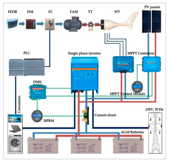 The experimental stand (Figure 1) presents an increased flexibility in that it can simulate distinct operations and supply options for household consumers with a certain installed power. The HRES includes the basic components necessary for operation, to which several modules necessary for electrical parameter monitoring are added, as well as for testing different operating scenarios particular to certain categories of household consumers: PV panels, wind turbines (WT), single phase inverters, PV MPPT controllers, wind turbine MPPT controllers, storage systems (AGM batteries), programmable logic controllers, an online electrical parameter monitoring module (OMS), and a high-precision battery monitor (HPBM). The wiring diagram of the HRES is presented in Figure 2.