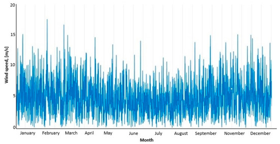 In order to estimate the wind potential in the Suceava County region, knowing the meteorological records regarding the speed, duration, frequency, and direction of the wind are essential. Information on solar and wind potential is necessary in order to be able to draw conclusions regarding the operation of the HRES in the Suceava County region. The variations in wind speed for the Suceava County region, which have been established through the HOMER Pro software, at a height of 50 m from the ground surface, are indicated in Table 1. The annual average wind speed, presented in Figure 6, in the Suceava County region is 4.88 m/s, with peaks of 17.61 m/s and a minimum value of 0.13 m/s [27].
