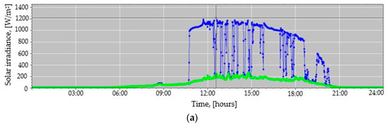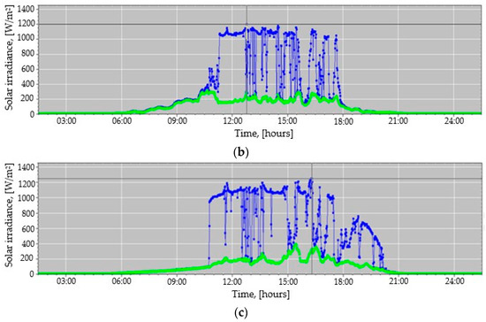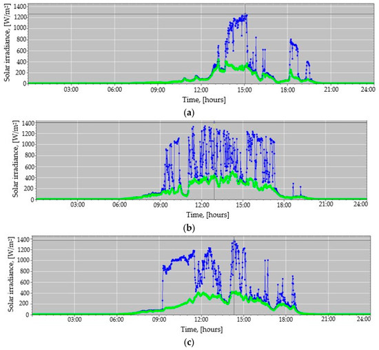 The tests within the first scenario were carried out from 900 o’clock 7 June 2022 to 1300 o’clock 9 June 2022, totaling 52 h of operation. During this period, the PV panels, being oriented in a two-axis tracking system, fed the household consumers, with a power level depending on the solar irradiance values. In order to have a general picture of the three days of HRES operation, from the point of view of the climatic conditions, in Figure 8a–c the variations of solar irradiance, with the two components total (blue color curve) and diffuse (green color curve), are presented, recorded with the SPN1 solar pyranometer. The maximum value recorded for this test period, for the total component, is 1239.89 W/m2.