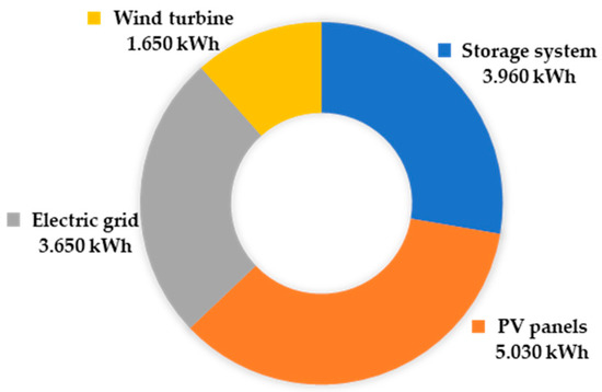 Table 2 shows the energy produced by each source and used to cover energy consumption. The energy consumption, achieved through HRES from all connected energy sources, is represented in Figure 9. It is observed that the energy produced by renewable sources, such as PV and wind (7.194 kWh), covers only a part of the consumption, while the difference is taken from the batteries (2.376 kWh) and the public electricity grid (4.060 kWh).