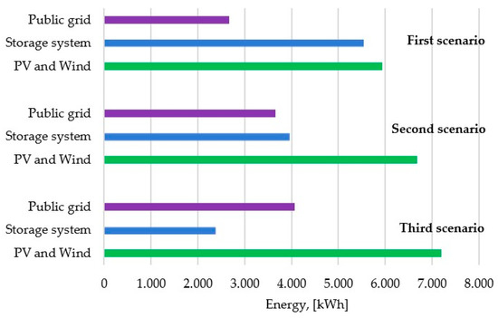 For each of the imposed scenarios, the necessary energy to cover consumption from the load curve was produced by renewable energy sources, as follows: 53%—first scenario, 47%—second scenario and 42%—third scenario. It is added to these percentages the energy stored in batteries: 18%—first scenario, 28%—second scenario and 39%—third scenario).