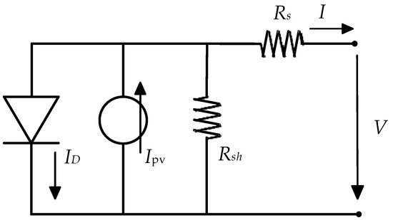 The basic unit of a PV module is the PV solar cell. An ideal PV solar cell model consists of a parallel p-n junction and a simulated current source that generates carriers [26]. Series and shunt resistors are also added because of the practical considerations of PV solar cells. The PV solar cell model is shown in Figure 1.