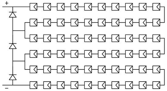 In order to meet the actual grid-connected voltage requirements of a PV power system, a typical crystalline silicon PV module consists of 60 or 72 PV cells connected in series. The circuit structure of a 60-cell PV module is shown in Figure 2. Every 20 cells are connected in parallel with a bypass diode to prevent the impact of a single faulty PV cell on the entire circuit.