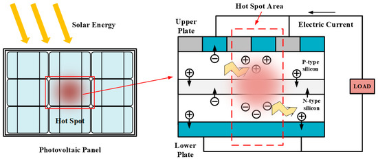 When the surface of a PV module is partially shielded, it can reduce the module’s ability to absorb light energy and affect the photoelectric effect of the silicon semiconductor. As a result, the series resistance of the module increases and the current through this part generates heat. If the module is shielded for a long time, heat accumulation can occur, leading to the formation of hotspots in the PV panel. As shown in Figure 3, the number of hotspots will gradually increase if the PV module operates in this state for an extended period. In addition, all the electricity generated by the normal operation of the PV cells is consumed in the non-normal working state of the PV solar cells. This can reduce the efficiency and service life of the PV module and affect its output electricity. Therefore, the real-time monitoring and detection of foreign matter shading on the surfaces of PV modules are essential for providing necessary data references for the safe operation, maintenance, and cleaning programs of PV modules.