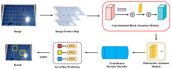 In order to further improve the performance of the network and adapt it to the problem of PV module foreign object detection, in this paper, we further optimize the Deformable DETR network by adding a convolutional block attention module (CBAM) [42] to the original model so that the model has better detection capability for small-size foreign objects. In this paper, the model is named IDETR and Figure 4 shows a schematic diagram of the IDETR model.