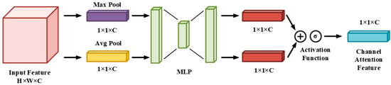 The channel attention module can highlight the key channels among the multi-channel features. As shown in Figure 6, the input feature mapping passes through the space-based maximum pooling layer and average pooling layer and then enters the multilayer perceptron (MLP). The output features of the MLP are summed and then passed through the sigmoid activation layer to generate the final channel attention feature. The channel feature map and the original input feature map are multiplied to provide the input for the subsequent spatial attention module. The formula is as follows: